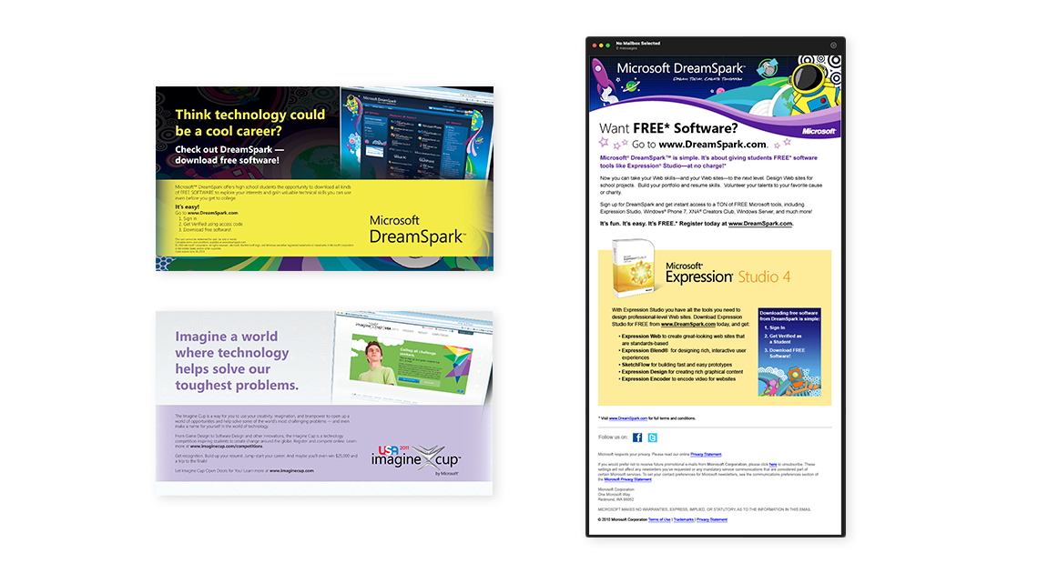 Postcard side 1: DreamSpark (now Azure Dev Tools) is a program that provides students with MicroSoft software design tools, developer tools, and other resources.