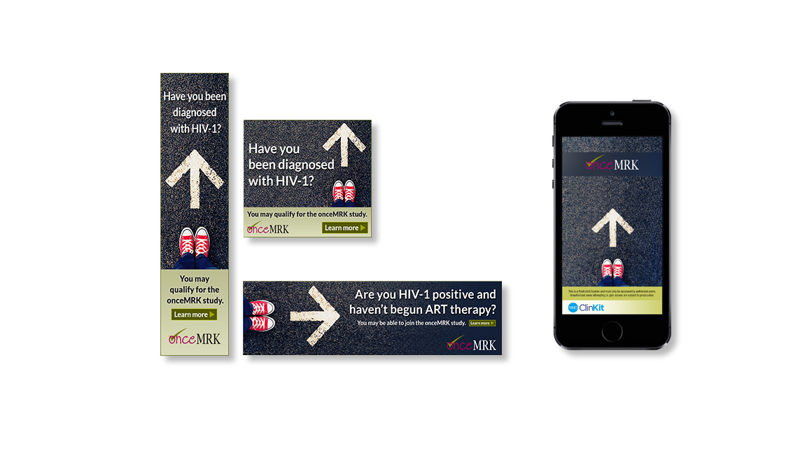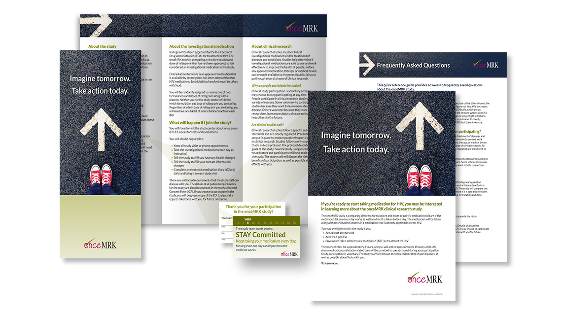 OnceMRK was a double-blind, placebo-controlled study in 797 treatment naive participants. Materials produced for recruitment and retention of subjects for 96-week duration. The study drug was approved based on 48-week results.