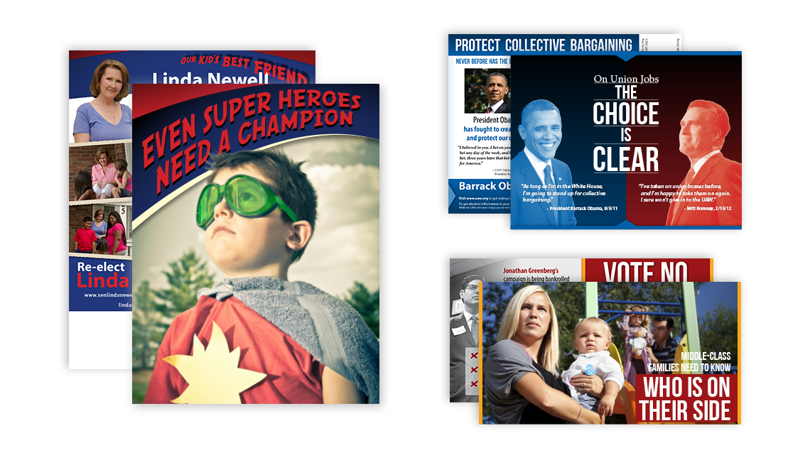 Just a few of more than 100 creatives developed over the course of about 4 weeks for the 2012 US election cycle. Linda Newell (Colorado State Senate), Elaine Nekritz (Illinois House of Representatives), and Barack Obama (US Prezi).